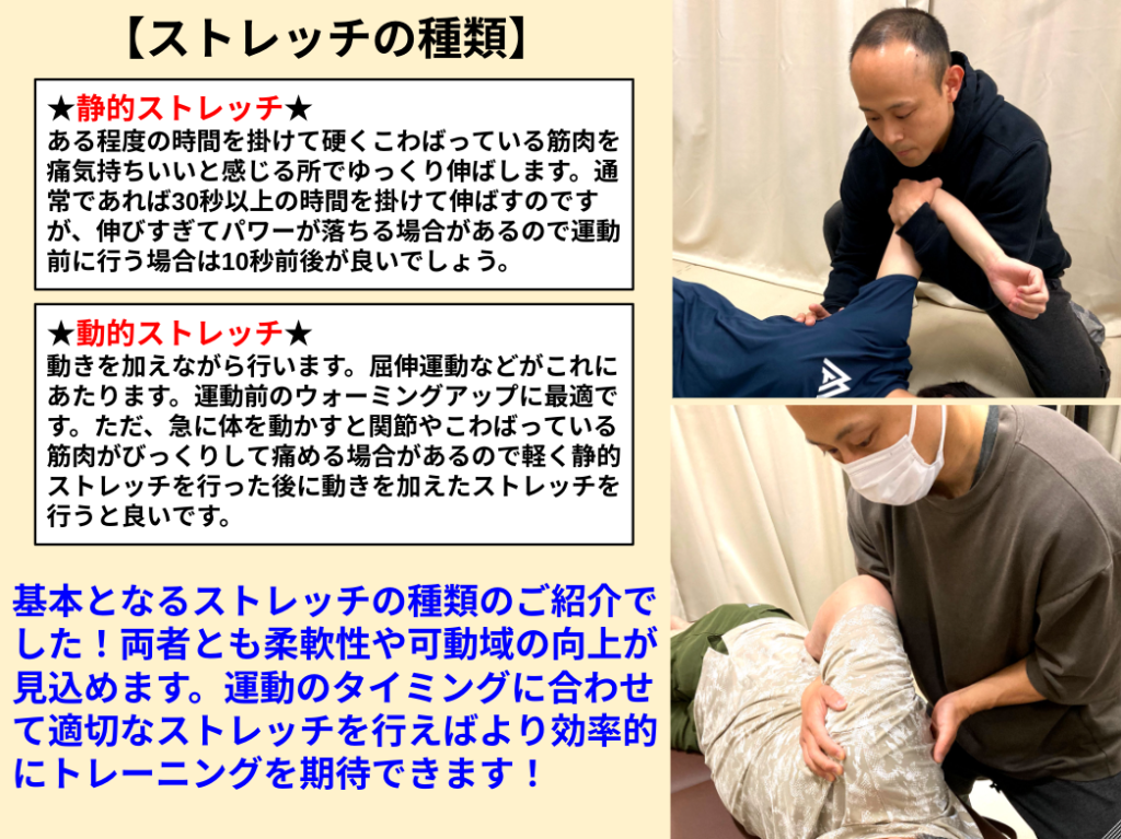 基本となるストレッチの種類のご紹介でした!両者とも柔軟性や可動域の向上が見込めます。運動のタイミングに合わせて適切なストレッチを行えばより効率的なトレーニングを期待できます!