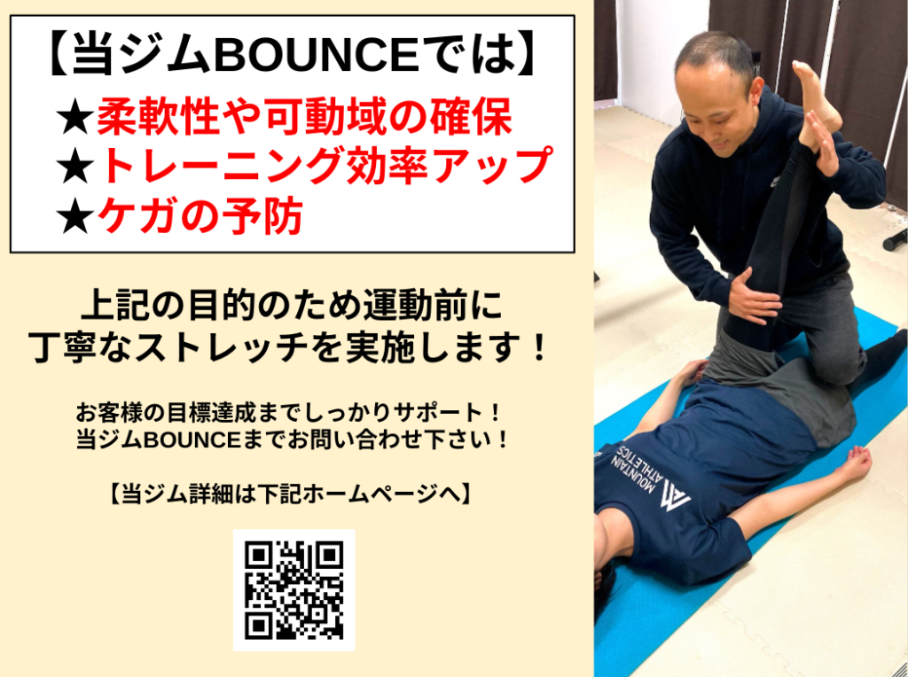 上記の目的のため運動前に丁寧なストレッチを実施します!お客様の目標達成までしっかりサポート!当ジムBOUNCEまでお問い合わせ下さい!