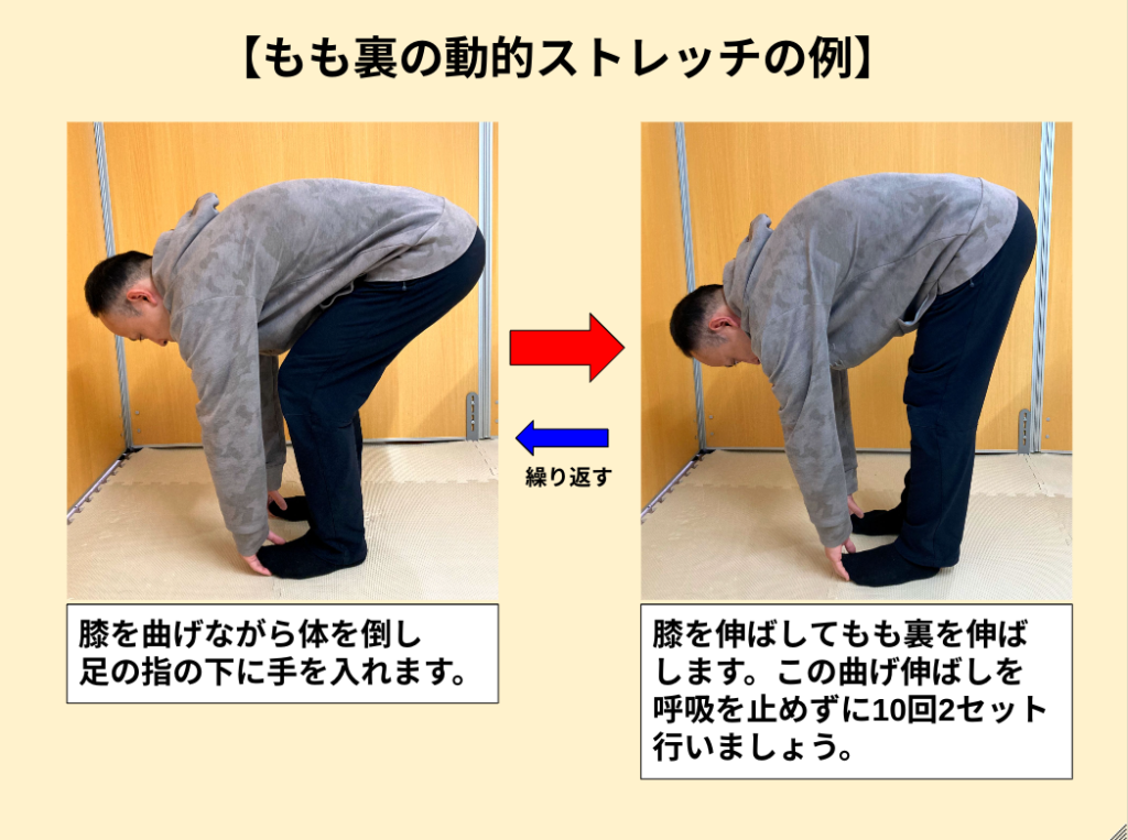 ある程度の時間を掛けて硬くこわばっている筋肉を痛気持ちいいと感じる所でゆっくり伸ばします。通常であれば30秒以上の時間を掛けて伸ばすのですが、伸びすぎてパワーが落ちる場合があるので運動前に行う場合は10秒前後が良いでしょう。