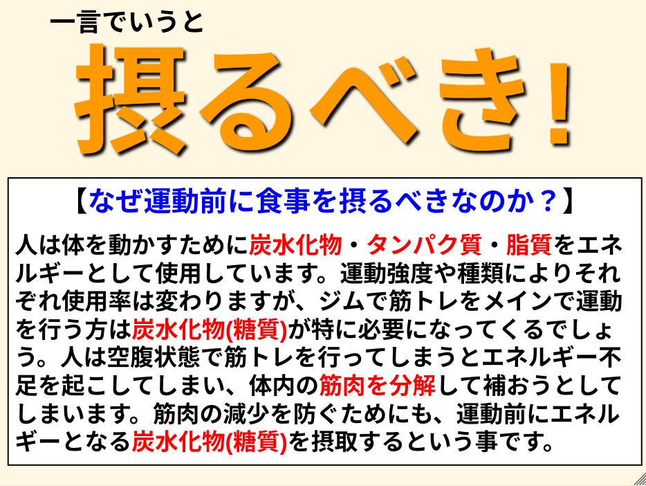 人は体を動かすために炭水化物・タンパク質・脂質をエネルギーとして使用しています。運動強度や種類によりそれぞれ使用率は変わりますが、ジムで筋トレをメインで運動を行う方は炭水化物(糖質)が特に必要になってくるでしょう。人は空腹状態で筋トレを行ってしまうとエネルギー不足を起こしてしまい、体内の筋肉を分解して補おうとしてしまいます。筋肉の減少を防ぐためにも、運動前にエネルギーとなる炭水化物(糖質)を摂取するという事です。