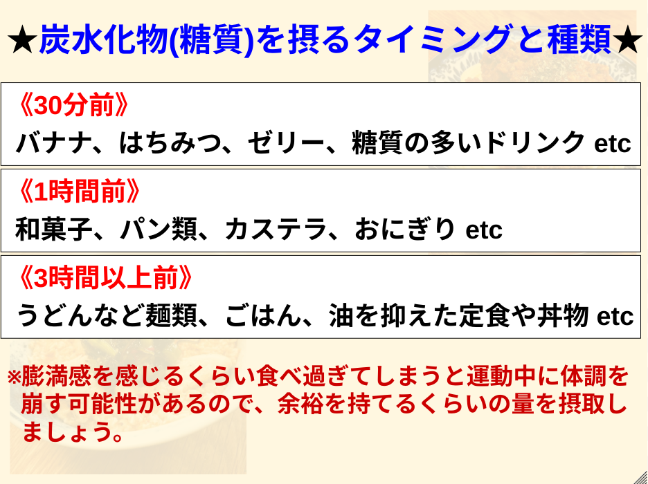 ※膨満感を感じるくらい食べ過ぎてしまうと運動中に体調を崩す可能性があるので、余裕を持てるくらいの量を摂取しましょう。
